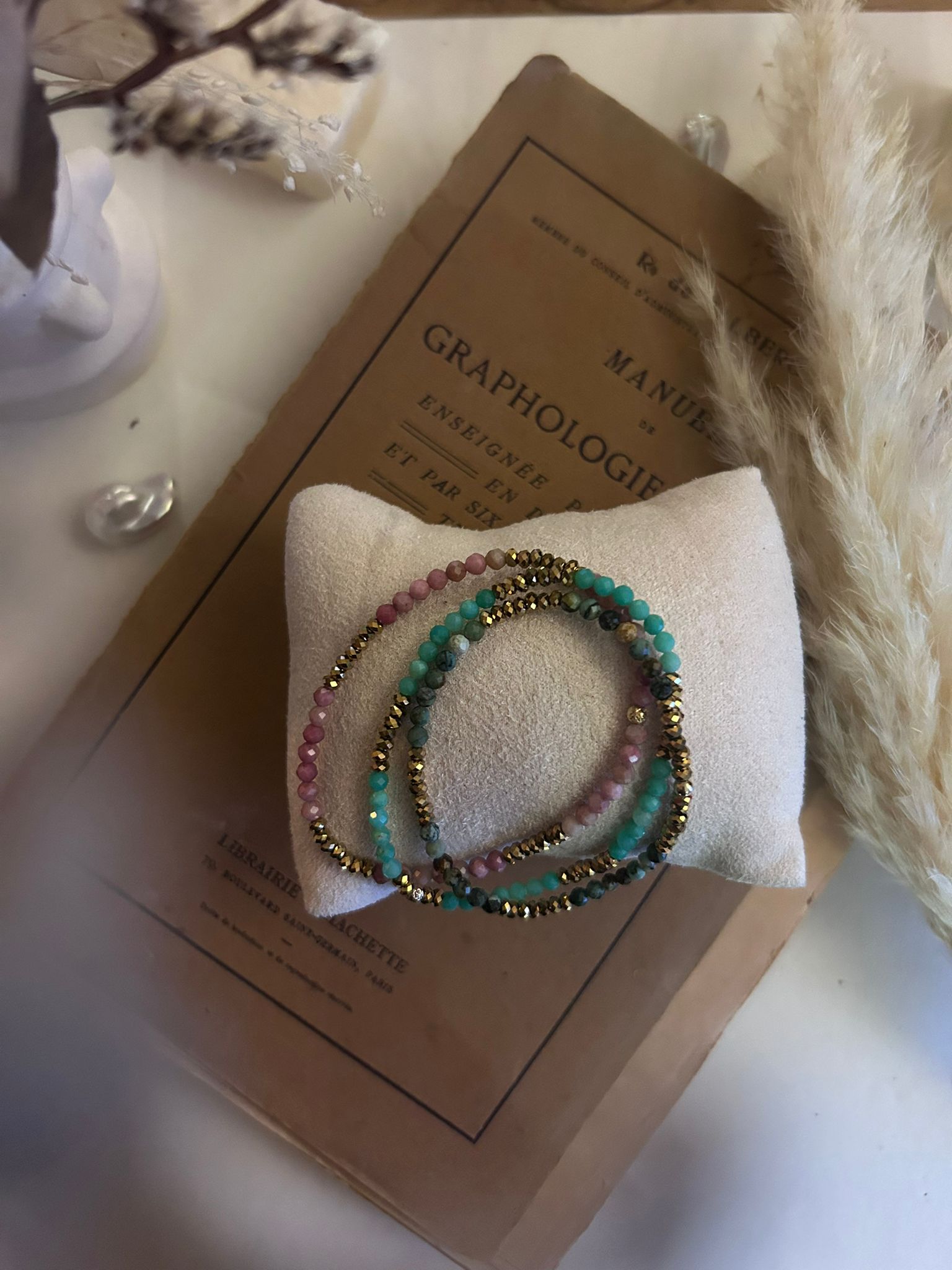 Un bracelet fin et délicat monté sur un fil élastique, rythmé par de petits tubes de turquoise d’Afrique et des pierres semi-précieuses subtilement associées.