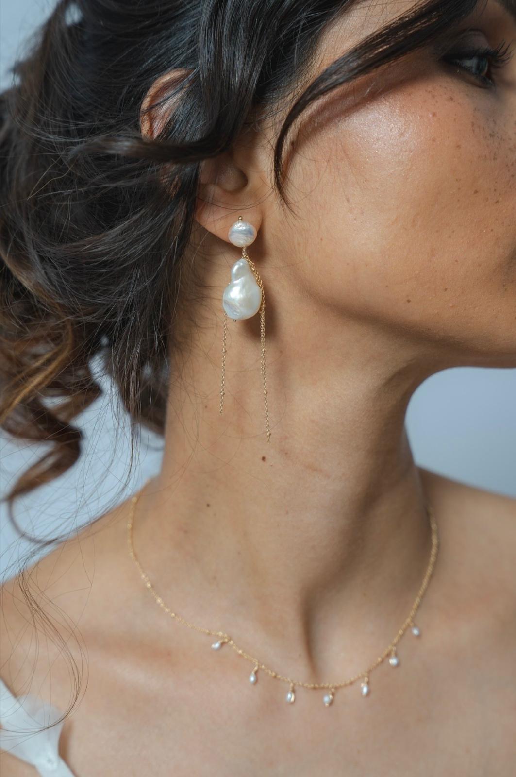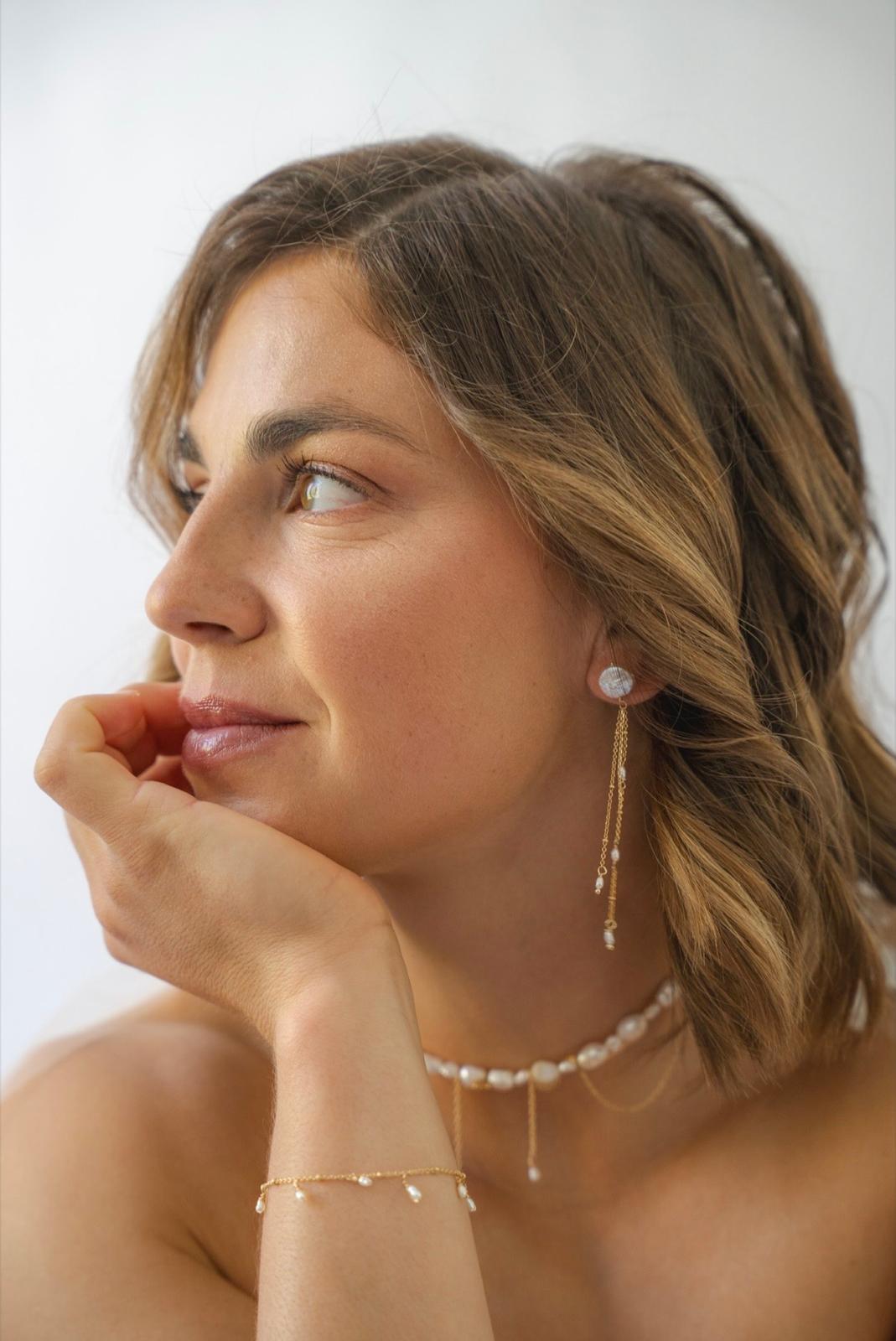Ce bracelet délicat, pensé pour le jour du mariage, se compose d’une fine chaîne en plaqué or, subtilement agrémentée de petits pendentifs que j’ai façonnés à la main, chacun orné d’une mini perle d’eau douce.