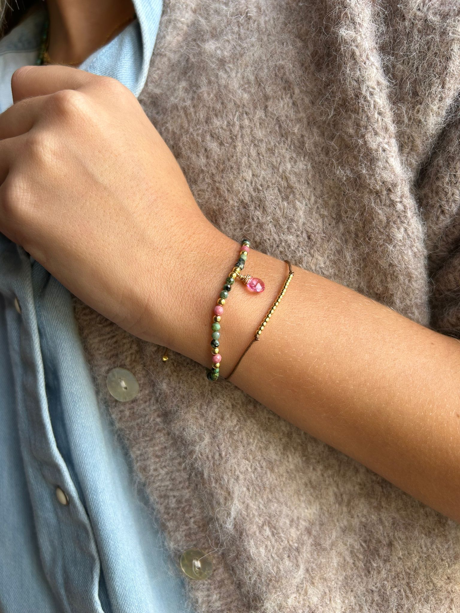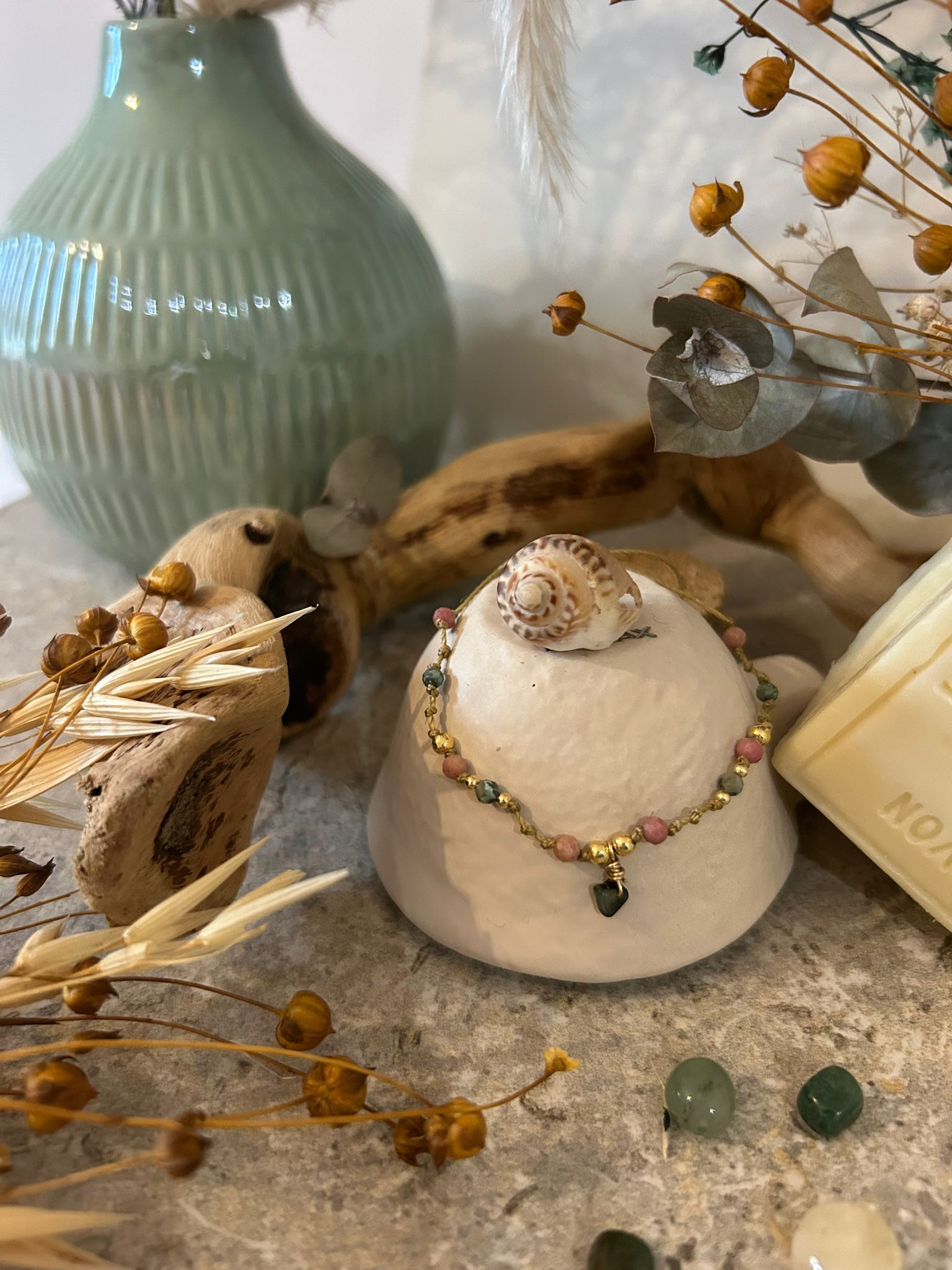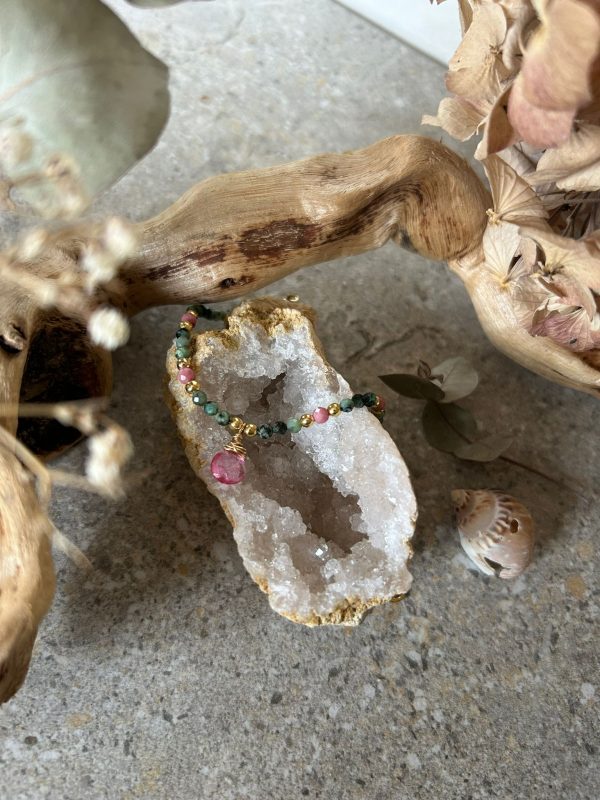 Embarquez pour un voyage coloré avec ce bracelet en turquoise d’Afrique et cette goutte en topaze rose. Préparez vous à faire tourner les têtes et à capturer des regards avec ce bracelet qui célèbre la magie des pierres.